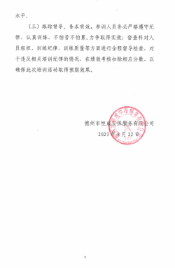 為貫徹落實德州市公安局、德州市教育和體育局《關于組織開展全市中小學幼兒園專職保安員培訓工作通知》要求,結合市公安局保安專題培訓,進一步提升中小學幼兒園專職保安員綜合素質,增強反恐防暴意識,提高校園保安員對突發暴力事件的應對能力,全力保障校園安全有序穩定。德州市恒威安保服務有限公司高度重視,立即安排部署相關工作。