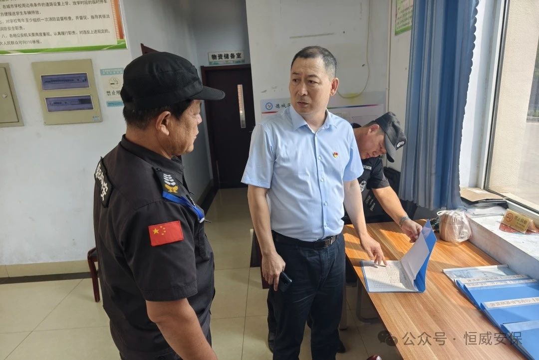 為確保此次檢查活動取得實際成效,公司黨支部書記、總經理王新衛親臨一線,實地對安居苑小學、明誠小學安保工作落實情況進行檢查。每到一處,王總對日常工作臺賬、學校監控、一鍵報警裝置、消防設施設備等安全防范重點區域進行檢查,并與當值保安員深入交流。